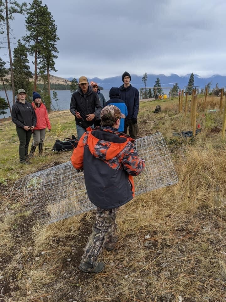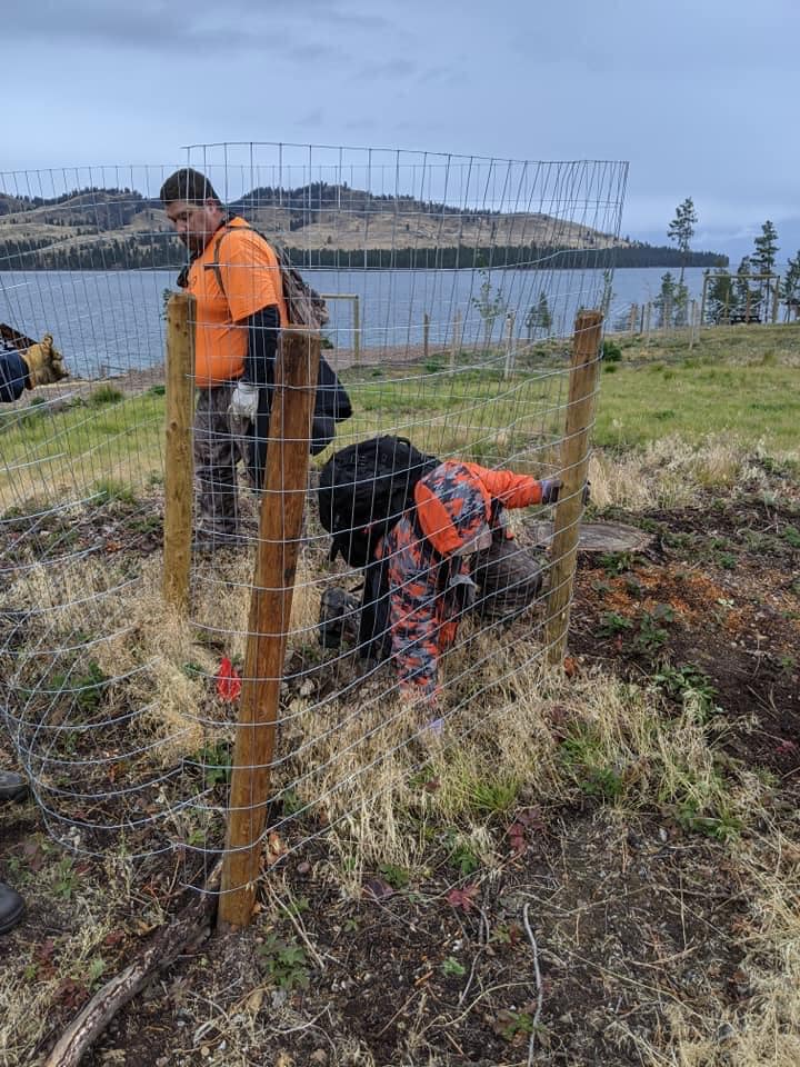 All 114 trees/shrubs were planted and fenced by 4 p.m., thanks to the pre-work by the Camp Ranger Duane Hille and his team – Transformation Team Members – and adult volunteers. Their setting the individual plants and enclosure fence posts, auguring the planting holes, laying out the mulch and soil amendments at each site, delivering of the plants as required and cutting and installing the fencing, aided the process significantly.