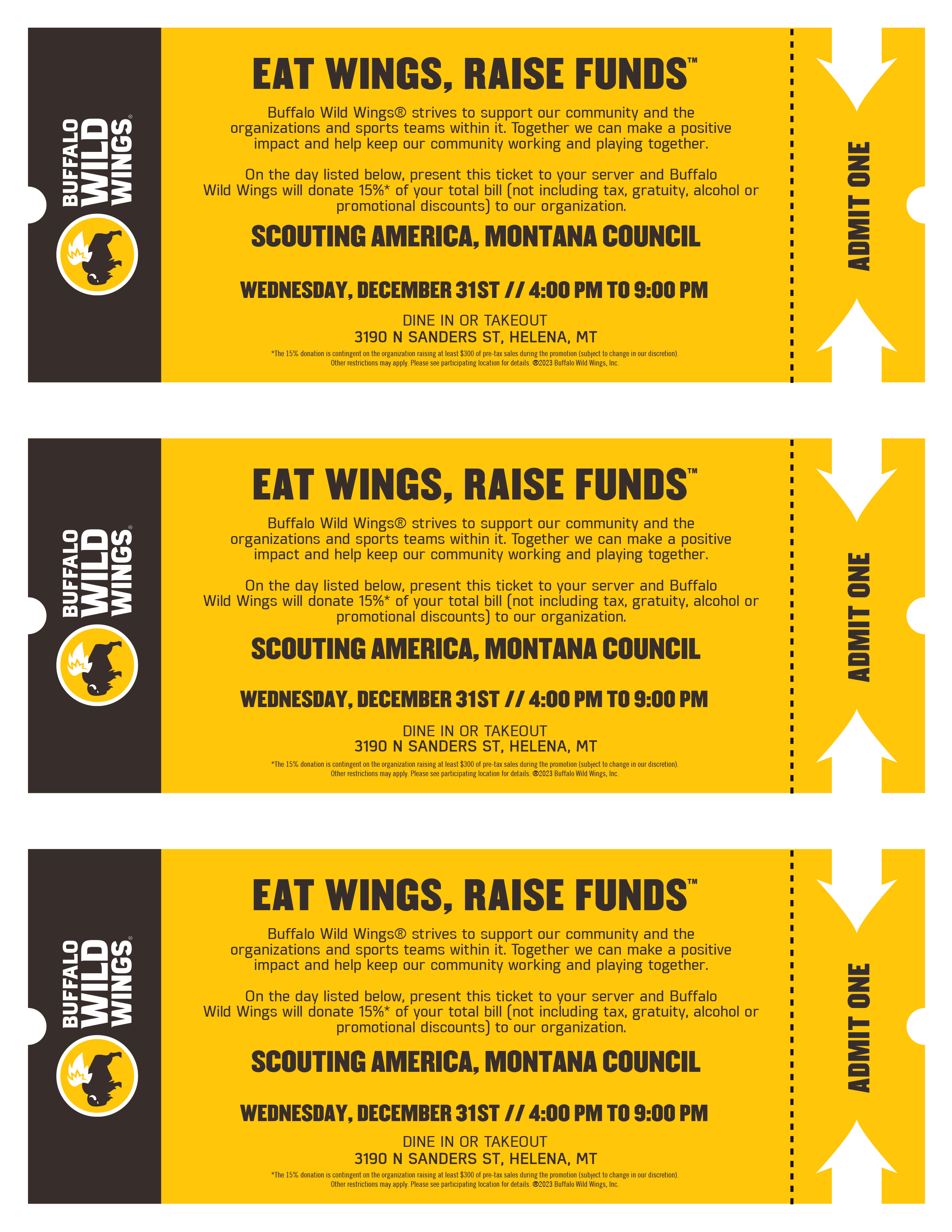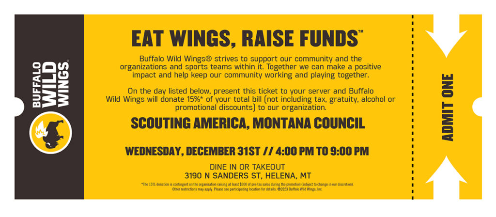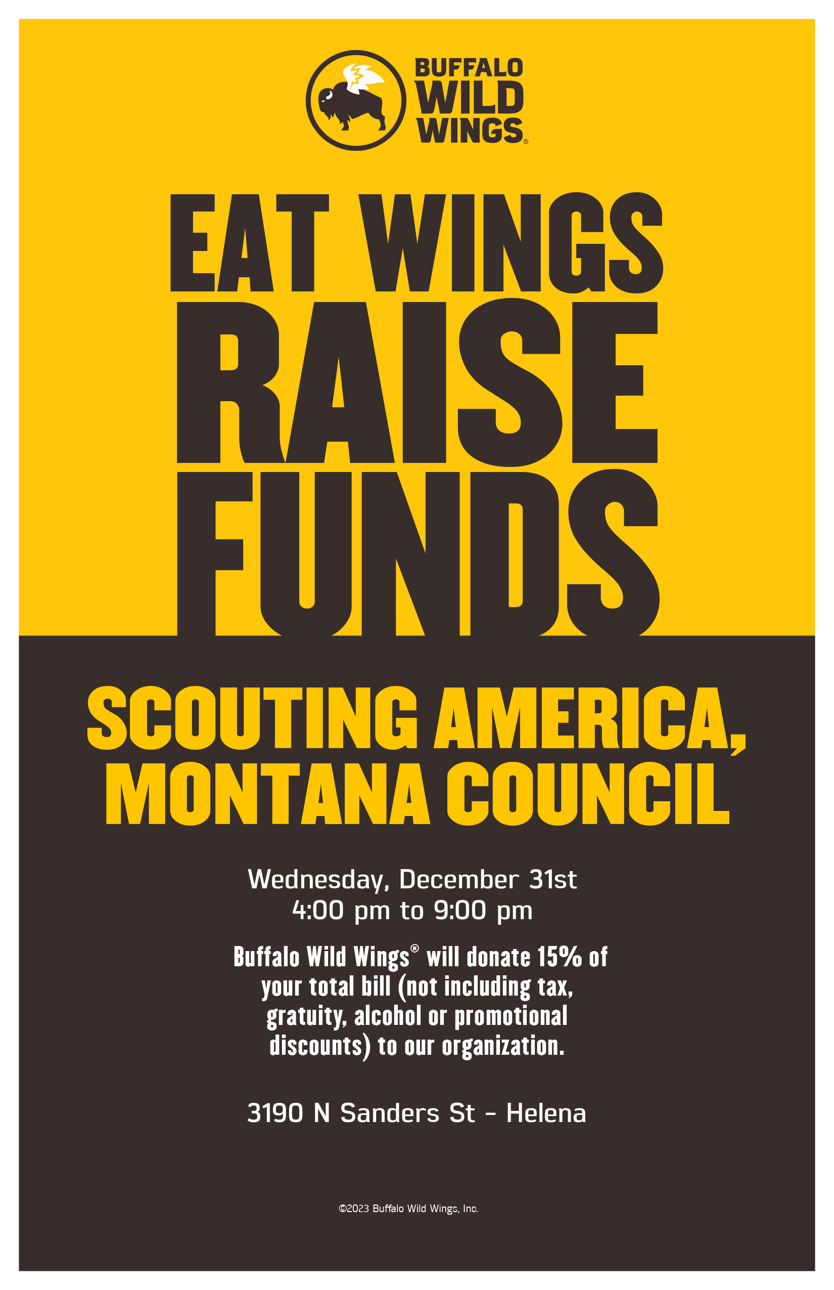 Bring your friends and family and join us for dinner! On the day of our event, Buffalo Wild Wings® will donate 15% of sales from redeemed coupons to the Montana Council. There’s no easier (or more delicious) way to support Scouting youth in our communities. Dine in or take food to-go! (Gift card purchases and delivery orders are excluded from event totals.)